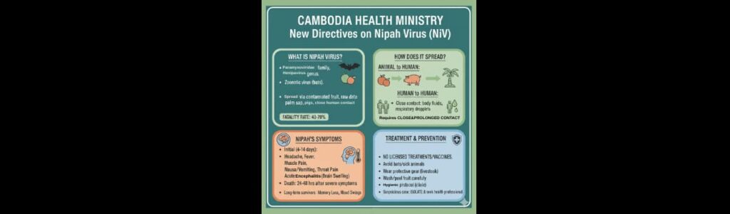 The Health Ministry of Cambodia published new directives on emergent cases of Nipah’s Virus (NiV). Although no transmission to humans has been recorded here, those preventive measures have to be noted and understood because the fatality of the virus is about 40% to 70% for humans, depending on the quality of health care and the stage where the disease is detected.